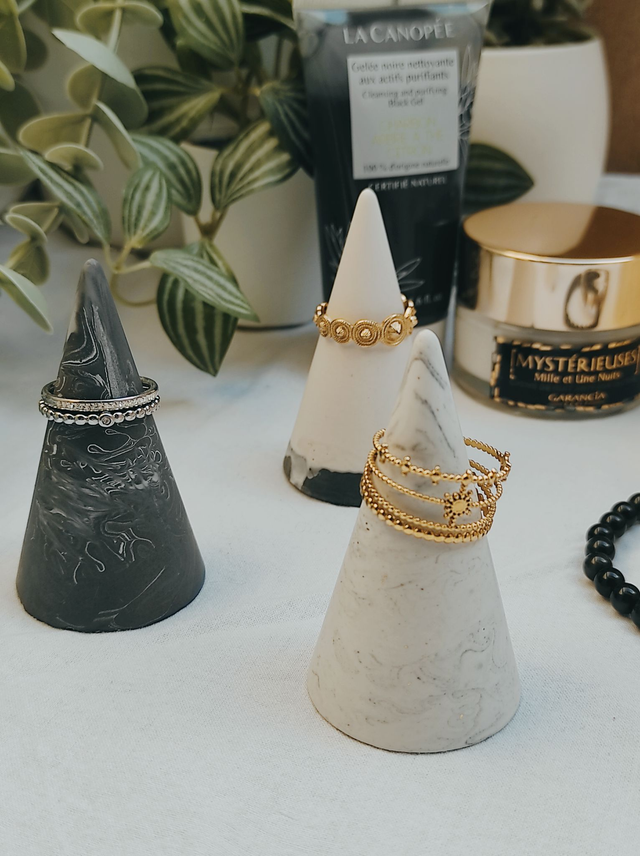 Ce porte-bague conique en jesmonite, fabriqué à la main, est à la fois minimaliste et élégant. Idéal pour organiser et exposer vos bagues avec style, il se décline en différentes couleurs et peut être personnalisé sur demande. Une touche artisanale parfaite pour votre décoration ou pour offrir.