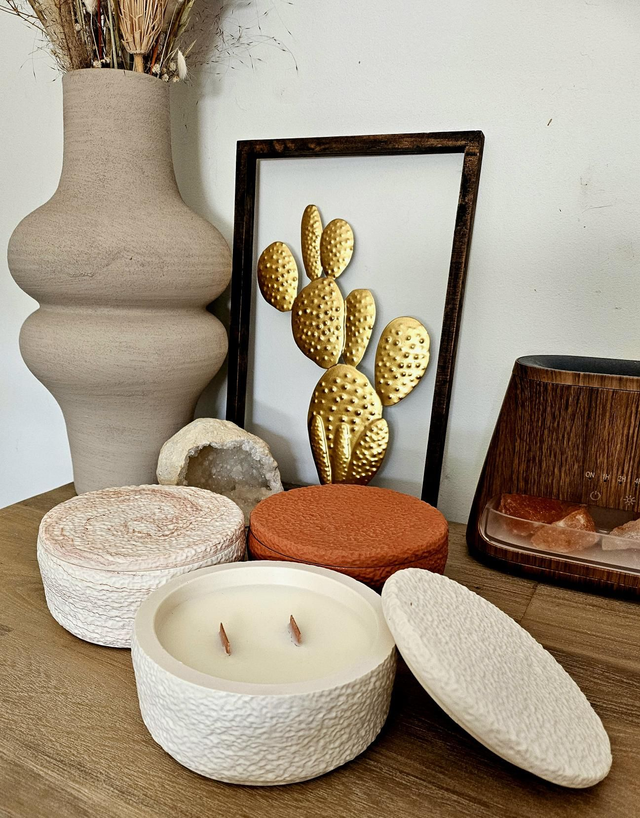 Bougie artisanale dans un pot en jesmonite avec couvercle, parfumée à la citronnelle. Chaque pot est façonné à la main, unique et protégé pour préserver son éclat.