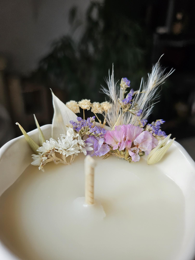 Bougie artisanale parfumée au mimosa, présentée dans un contenant en forme d’œuf. Décorée de fleurs séchées, chaque bougie est unique et fabriquée avec soin à la main.